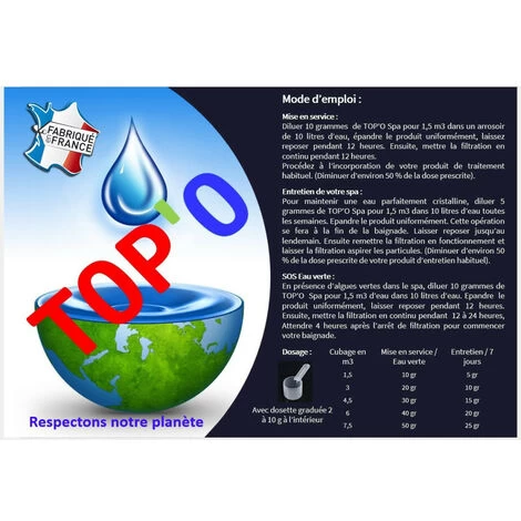 Pour maintenir une eau parfaitement cristalline, diluer 5 grammes de TOP’O Spa pour 1,5 m3 dans 10 litres d’eau toutes les semaines. Epandre le produit uniformément. Cette opération se fera à la fin de la baignade. Laisser reposer jusqu’au lendemain. Ensuite remettre la filtration en fonctionnement et laisser la filtration aspirer les particules. (Diminuer d’environ 50 % de la dose prescrite de votre produit d’entretien habituel).