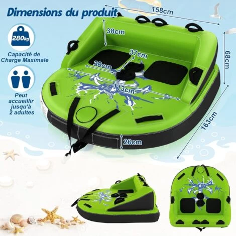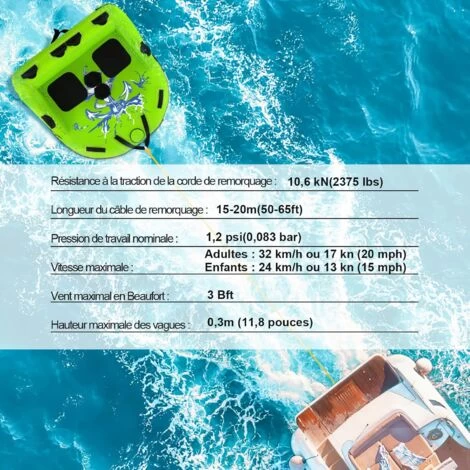 - 【Grande taille pour 2 personnes】Cette bouée tractable permet à 2 passagers de naviguer en même temps, avec une capacité de poids totale de 300 kg. Le dossier extra haut et le grand siège augmentent la stabilité et l’équilibre. De plus, les bouées pour les bateaux peuvent être utilisées par les adultes ou les jeunes.