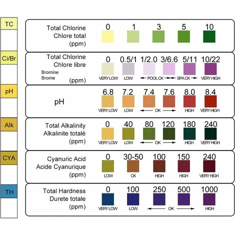 【Test 6 en 1】Les bandelettes de test peuvent être utilisées pour tester le pH, le chlore total, le chlore libre, l’alcalinité totale, l’acide cyanurique, la dureté totale.