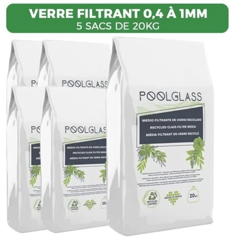 LOT DE 5 SACS 20KG VERRE FILTRANT 0,5 A 0,8MM Contribue à la qualité de votre filtration en améliorant sa finesse, rend l’eau plus claire et limite l’encrassement du filtre et ralentissant les dépôts calcaires.