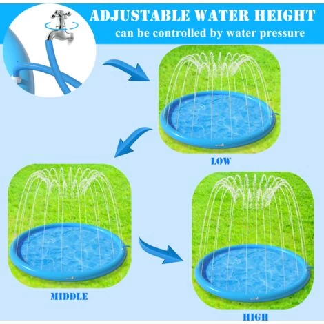 splash pad a une épaisseur de 10 cm avec une soudure serrée, ce qui peut bien résister à une plus grande pression d’eau et garantir que la direction de pulvérisation est pulvérisée vers l’intérieur pour ne pas remplir votre jardin d’eau.