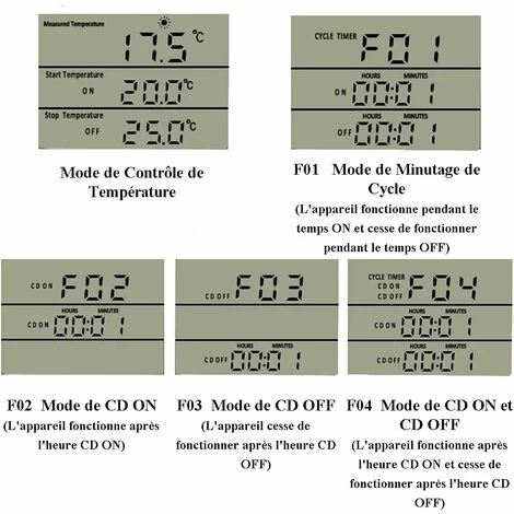 Plus de fonctions : 5 modes au choix (mode contrôle de la température, mode minuterie de cycle F01, mode compte à rebours F02 activé, mode compte à rebours F03 désactivé, compte à rebours F04 activé et compte à rebours désactivé). Grand écran LCD. étalonnage